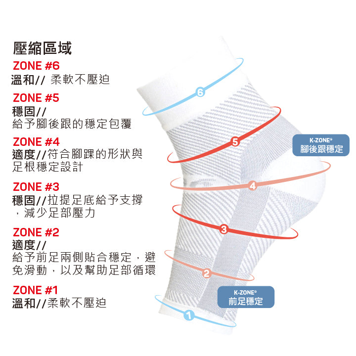 OS1st® DS6® Night Time PF Treatment減壓足弓襪套使用專利分區壓縮技術,採用了頂級的精密針織機精準地將產品劃分多個壓力區域,針對肢體關節各部位提供不同壓力值的加壓和穩定,並舒緩因日常生活過度使用而產生的不適。
